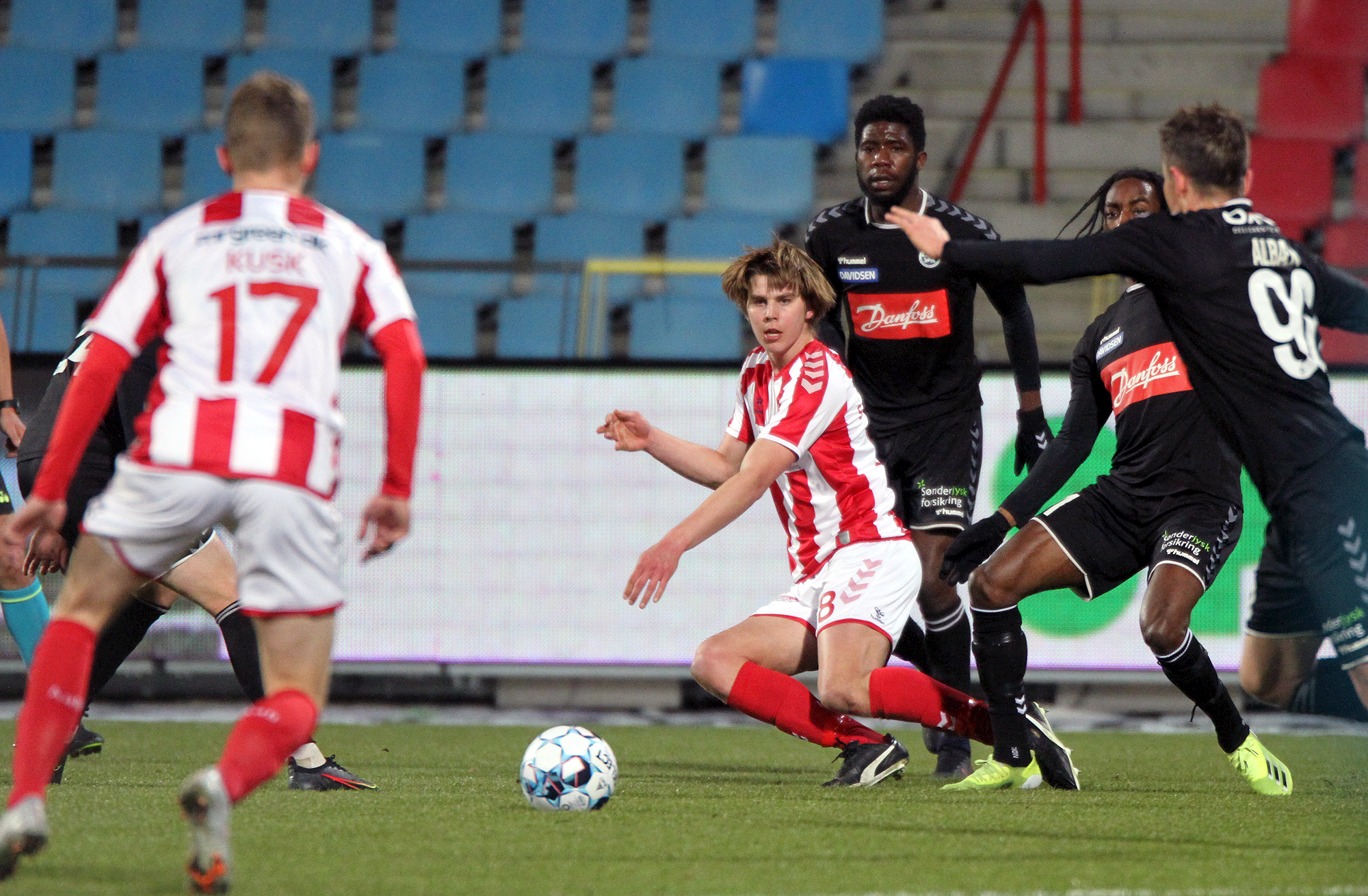 SønderjyskE (4-3-3): Lawrence Thomas, Jeppe Simonsen, Patrick Banggaard, Stefan Gartenmann, Marc Dal Hende, Rasmus Vinderslev (46: Emil Frederiksen (90: Pierre Kanstrup)), Victor Ekani, Mads Albæk, Julius Eskesen (80: Bård Finne), Anders K. Jacobsen, Peter Christiansen (61: Haji Wright).