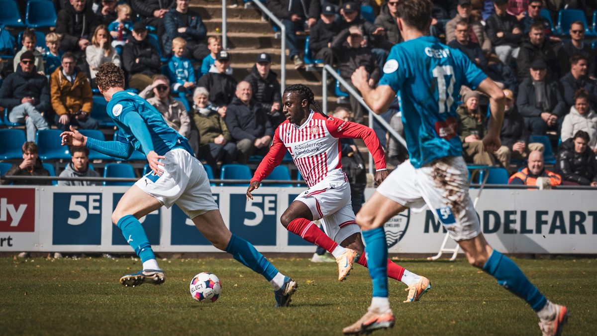 I stedet blev det straks efter 2-0 for hjemmeholdet. På højrekanten sendte Jonas Willemoes Jerailly Wielzen i dybden, og hollænderen sparkede fra en spids vinkel kuglen i mål ved nærmeste opstander.